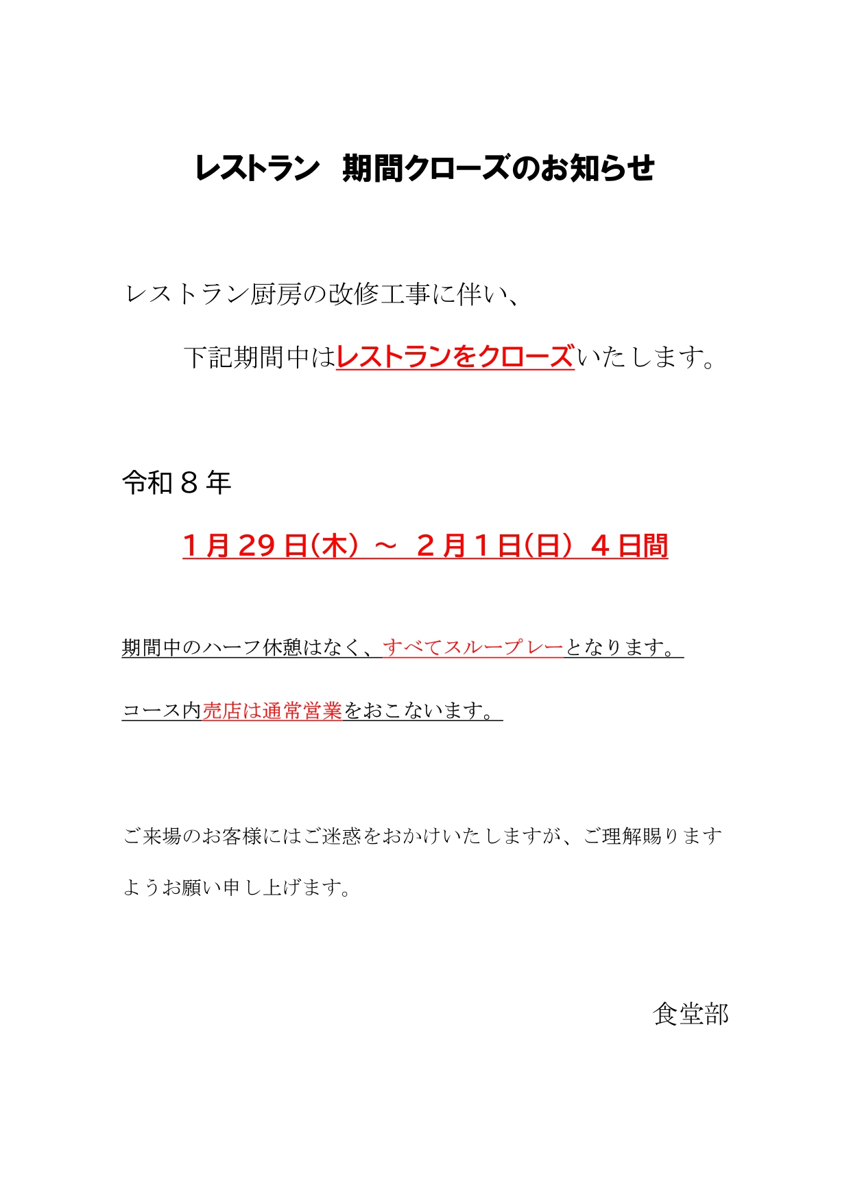 ◇ レストラン期間クローズのお知らせ R8/1/29(木)~2/1(日)